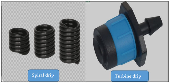 The first factor was the types of drippers, which were spiral and turbo. The spiral dripper is an internal channel that takes the shape of a snail, and is characterized by a long water path with a small diameter ranging from 1 to 2 mm. The idea of its operation is to resist the flow of irrigation water, thus reducing the flow speed, achieving balanced pressure, and discharging the water in the form of water droplets. The turbo dripper is characterized by a vortex circular flow, which reduces the occurrence of sediment inside the water stream in the dripper, which increases performance in agricultural environments. It is also characterized by the self-regulation of pressure, which ensures equal distribution of water, with ease of disassembly and assembly, as well as ease of controlling the opening of the drippers (Figure 7). The second factor was the rotation of irrigation water salinity. The rotations of irrigation water salinity were as follows: A: Binary rotations (L and H), meaning low (L) salinity irrigation water (fresh water) with an EC of (1.35–1.6) ds m−1 was used in the first irrigation. While in the second irrigation, high (H) salinity water (drainage water) with (6.45–6.9) ds m−1 was used. Thus, the irrigation process was repeated using fresh water (L) in the third irrigation, and drainage water (H) in the fourth irrigation, and so on. B: Triple rotations (H, L, and H): In this rotation, drainage water (H) was used in the first irrigation, fresh water (L) was used in the second irrigation, and then drainage water (H) was used in the third irrigation. The irrigation started again with drainage water (H) used in the fourth irrigation, and fresh water (L) was used in the fifth irrigation, and the drainage water (H) was used in the sixth irrigation, and so on. C: Triple rotation (L, H, and L): The first irrigation was conducted using fresh water (L), the second irrigation was conducted with drainage water (H), and then the third irrigation was used with fresh water (L). The irrigation started again with fresh water (L) used in the fourth irrigation, and drainage water (H) used in the fifth irrigation, and then fresh water (L) used in the sixth irrigation, and so on.