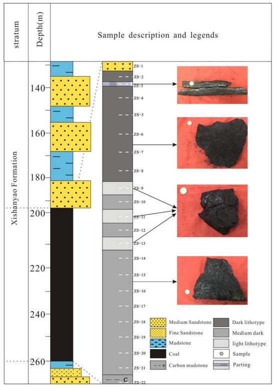 Dzungaria Basin is located in northern Xinjiang at the junction of the Altai Mountains and Tianshan Mountains. It is bordered by the Dzungaria western mountainous region to the west and the Baytik Piedmont to the east [14]. The shape of Dzungaria Basin is an irregular triangle, with the northern part at a higher altitude than the southern part. Influenced by east–west compression stress, Dzungaria Basin has developed a series of contemporaneous sedimentary faults. The sag and salient structures trend north–east or north–south. The sag structures led to the formation of coal-bearing strata, while the salient structures did not [15,16]. The basin is rich in coal, petroleum, and gas resources. The main target for this study was the coal seam of the Aalenian Stage from the Middle Jurassic period in the Wucaiwan depression located in the eastern Dzungaria Basin [17]. The thickness of the seams in the research area is 63 m. The coal has a low ash content, low sulfur content, and high caloric value, presenting high commercial value due to the proven substantial coal reserves.