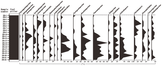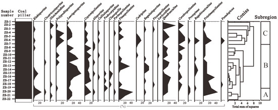 Based on the changes in the vertical abundance of pollen, and using the CONISS algorithm of the Tilia software to cluster and analyze the pollen data, the thick coal seams in the Wucaiwan mining area of Zhundong were divided into three zones from the bottom to the top: A, B, and C (Figure 3 and Figure 4; [33]).