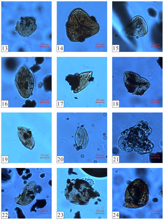 Spore and pollen plate photographs from the extra-thick coal seams of the Aalenian Stage in the ECDBs (Part 2). (13) Lophotriletes, (14) Dictyophyllidites, (15) Dictyophyllidites, (16) Cycadopites, (17) Cycadopites, (18) Cycadopites, (19) Cycadopites, (20) Chasmatosporites, (21) Pinuspollenites, (22) Pinuspollenites, (23) Cerebropollenites, and (24) Classopollis.