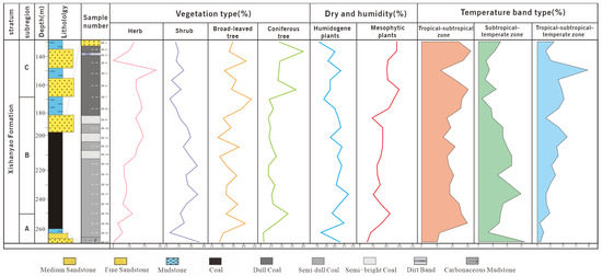 The relationships among the plant composition, dry–humid zones, and climate zone types show that the proportion of shrubs continuously decreased from the bottom to the top of the coal seam, peaked at the bottom of Group B, and then decreased in Group C. The number of coniferous plants increased continuously from Group A to Group C. In Group A, the number of coniferous plants was low. The number increased steadily in Group B and then displayed a sharp increase and peaked in Group C. The numbers of broad-leaved plants and herbs were insignificant for the whole area, but the number of herbs increased in Group B. The dry–humid zone showed an obvious change from the bottom to the top of the coal formation. A large number of humidogenic plants were found in Group A, but they decreased continuously. Conversely, the number of mesophytic plants increased. The number of xeric plants was lower in Group A; they began to appear in Group B and peaked in Group C. The growth habits of various plants indicate that the abundance of vegetation in the tropical–subtropical–temperate zone reached 30% and stayed around 15%. The subtropical–temperate plants mainly existed at the bottom of the coal seam, with an extremely low number at the top of the coal seam. The proportion of plants in the tropical–subtropical zone was higher than 40% and even reached up to 60% (Table 1 and Figure 7).
