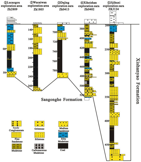 During the Indo-China Movement, the orogenic zones around the research area experienced further uplift and developed thrust nappe structures due to the proximity of the Qinling–Kunlun Ocean and the rise of the Kunlun–Qinling belt in the Late Triassic period [18,19,20]. Coal-bearing formation was minimal because of the overall uplift of the basin and mountains [21,22,23]. During the early Yanshanian period, the uplift of the basin and mountains became stable, leading to the development of broad basins and large lakes in the Early and Middle Jurassic periods, which culminated in the largest coal accumulation event [22,24,25,26,27]. During the middle and late periods of the Yanshan Movement, the reactivity and uplift of the orogenic zone in the northwest increased due to the extrusion stress from both the East Asia multi-directional convergent tectonic system in the north and the closure of the middle Tethys Ocean Basin in the south. This led to the disintegration of the large basin and the shrinkage of lake basins, accelerating the development of the reverse faults and halting the coal-bearing formation [14,17,28]. In the Aalenian Stage, the provenance mainly originated from the Kelameili Mountains in the north. The coal seams had typical district development with various coal enrichment centers. Four independent depressions were formed due to the influence of the Indo-China and Yanshan Movements: the Wucaiwan depression, the Shishugou depression, the Shiqiantan depression, and the Wutongwozi depression [29]. These depressions formed relatively independent artesian basins due to the differences in sedimentation. This study was performed in the Wucaiwan depression (Figure 1).