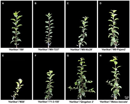 32]. Therefore, it is necessary to select suitable rootstocks for cultivated varieties. In this study, we grafted ‘Harlikar’ onto eight rootstocks and observed the effects of the rootstocks on parameters related to tree architecture, such as plant height, branch number, internode length, leaf photosynthetic capacity, and N/P/K content. Among the eight rootstock/scion combinations, branching formation and plant height, characteristics that affect fruit cultivation, were the traits that differed most. To analyze the molecular mechanisms that underlie the modification of scion architecture by rootstocks, we used RNA sequencing to analyze gene expression patterns in leaves of ‘Harlikar’ grafted onto different dwarfing rootstocks. The findings will aid the selection and utilization of apple dwarfing rootstocks in the future and increase our understanding of the mechanisms influencing shoot growth and development in grafted trees.