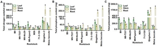 Figure A7). Therefore, the total K contents in the above-ground parts of ‘Harlikar’/‘M9-Nic29’ and ‘Harlikar’/‘71-3-150’ were significantly higher than in ‘Harlikar’/‘