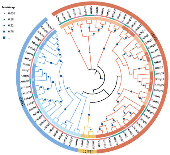 The physicochemical characteristics of members of the CsHsf family were assessed utilizing the ProParam tool available on the Expasy online software platform (https://www.expasy.org/; accessed on 2 July 2024). The subcellular localization of these proteins was forecasted using Plant-mPLoc (https://www.csbio.sjtu.edu.cn/bioinf/plant-multi/; accessed on 2 July 2024).