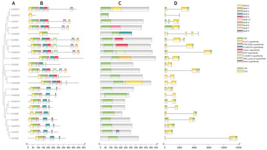 To identify conserved motifs within the CsHsfs, the MEME website (https://meme-suite.org/meme/tools/meme, accessed on 3 July 2024) was employed, configured to search for 10 patterns while maintaining the default settings. The protein sequences were analyzed using the NCBI Batch Web CD-Search tool (accessible at https://www.ncbi.nlm.nih.gov/, accessed on 3 July 2024) to predict their conserved domains. The gene structure, including its introns and exons, was depicted through the Gene Structure Display Server (GSDS2.0; https://gsds.gao-lab.org/, accessed on 6 January 2025).