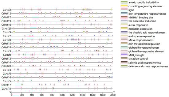 In order to deeply investigate the response of CsHsf genes to abiotic stresses, we used preliminary experimental validation and data analysis (Figure 4). We found that CsHsfs contain a series of cis-regulatory elements, stress-related elements (anaerobic induction, low-temperature responsiveness, anoxic specific inducibility, and defense and street responsiveness), hormone-related elements (salicylic acid response, abscisic acid response, MeJA response), and development-related components (light responsiveness, meristem expression, control of circadian rhythms). The results showed that there were 18 genes with cis-acting elements related to light response, 8 genes with cis-acting elements related to low-temperature response, and 12 genes with cis-acting elements related to the abscisic acid reaction.