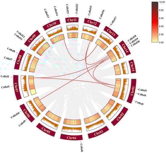 Collinearity among CsHsf members in Camellia sinensis. Red lines represent collinear relationships among CsHsf members, and the gray line indicates all duplicate gene pairs.