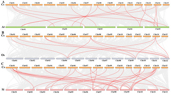 Collinearity analysis plot of Camellia sinensis with Arabidopsis thaliana, Oryza sativa, and Solanum lycopersicum. Subfigure (A) shows Camellia sinensis and Arabidopsis thaliana. Subfigure (B) is Camellia sinensis and Oryza sativa, and Subfigure (C) is Camellia sinensis and Solanum lycopersicum. Collinear blocks are marked with gray lines, while collinear gene pairs with Hsf genes are highlighted with red lines.
