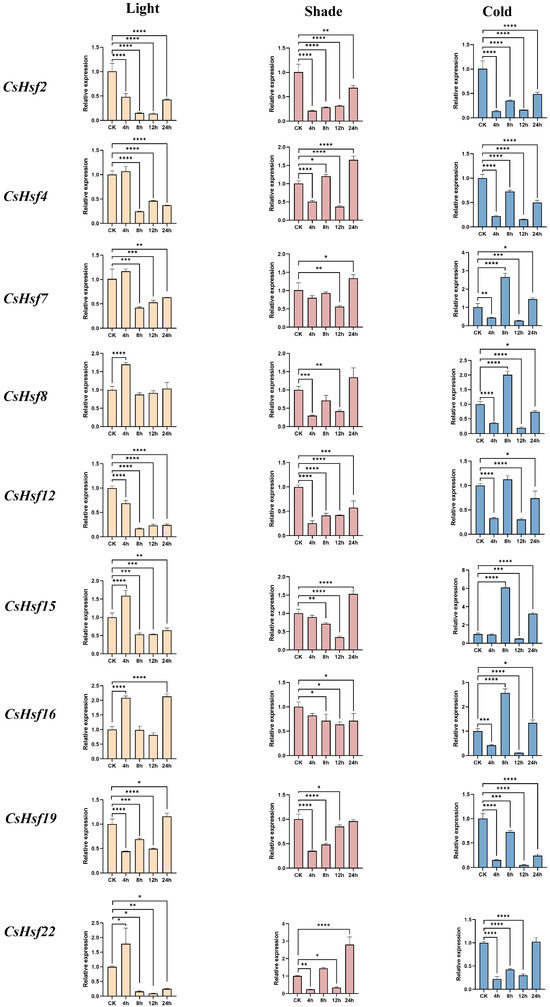 qRT-PCR analysis of CsHsf genes under abiotic stress. Light, shade, and cold stress conditions were used for 4 h, 8 h, 12 h, and 24 h, respectively. The data were means ± SD of three biological repeats.* p ≤ 0.05; ** p ≤ 0.005; *** p ≤ 0.0005; **** p ≤ 0.0001.