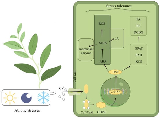 Hsf plays an important role in the plant response to abiotic stress [48]. Plants can mitigate the effects of abiotic stress by modulating the expression of various Hsf genes. Upon sensing environmental stress signals, such as low temperature, light changes, or darkness, plants activate downstream signaling pathways via Ca2⁺ receptors to regulate their adaptation to adversity. When Ca2+ binds to calmodulin (CaM) [49], it induces the expression of key genes like CDPK, initiating multiple stress tolerance pathways [50]. Previous studies have shown that specific types of transcription factors of HSF not only regulate the expression of HSP genes but are also involved in interactions between HSP proteins [51,52]. All of us hypothesized that HSF first expresses HSP proteins before initiating the regulation of the expression of core enzymes in the lipid metabolic pathway (e.g., GPAT, SAD, KCS), followed by the promotion of the synthesis of key lipids, such as phosphatidic acid (PA), phosphatidylethanolamine (PE), and digalactosyldiacylglycerol (DGDG), thereby enhancing cell membrane stability and increasing cold resistance [53]. Under stress, the expression of genes related to jasmonate (MeJA) synthesis is suppressed, leading to reduced MeJA pathway activity, accompanied by malondialdehyde (MDA) accumulation and electrolyte leakage, indicating cellular damage [54]. Our study found that some genes involved in the stress response contain MeJA response elements, and the presence of these elements is closely related to the sensitivity of genes to stress signals. The expression of the CsHsf gene promotes the accumulation of ABA, which in turn promotes the synthesis of MeJA, thereby increasing the activity of antioxidant enzymes. The accumulation of MeJA also increases the production of jasmonic acid (JA), and all these series of changes significantly improve the plant’s stress tolerance [55]. In our study of cis-elements (Figure 4), we found a potential relationship between CsHsfs and these key response proteins, suggesting that CsHsfs may be resistant to environmental stress through the interaction of these proteins. Plants produce toxic reactive oxygen species (ROS) in response to different types of stresses, and the excessive accumulation of ROS is harmful to cells. Therefore, the timely removal of ROS becomes crucial for plants to enhance their stress tolerance. With the rising MeJA content, the antioxidant system of plants is activated and the ROS scavenging rate improves [56]. Plants demonstrate their multi-level adaptive capacity and physiological regulation potential by maintaining stable growth under complex environmental stresses through multiple defense mechanisms in vivo, such as signal transduction, metabolic regulation, and gene expression regulation (Figure 8). This mechanism is derived from our research on CsHsfs and other hypotheses about plant responses to stress. More experiments are needed to confirm whether CsHsfs help plants cope with stress challenges by regulating the expression of related proteins.