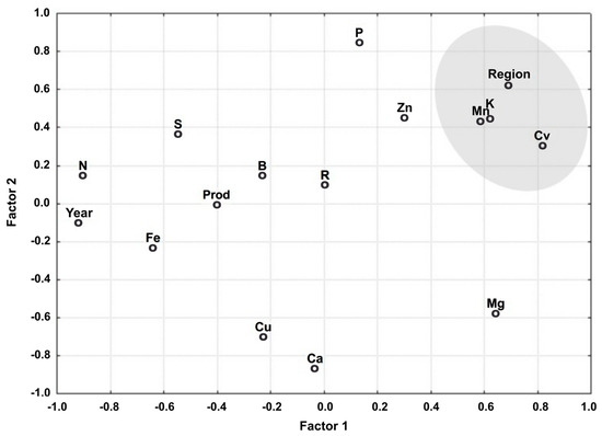 Values with significance ≥ 0.70 correspond to eigenvectors >1 [16]. Thus, the variables highlighted in bold were those that contributed the most because of the highest significance (p > 0.05) among the nutrients. They explained 75.4% of the model. We further highlight that factor 1 was the most important for the study because of its highest eigenvalue and explanation of 36.9% of the variance. The variables that contributed the most were region (most relevant), cultivar, year of cultivation, and the nutrients K, Mn, Ca, Mg, B, and R (residue).