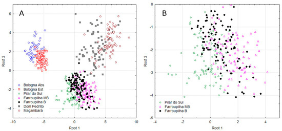 Given the close proximity of the groups in the discriminant analysis (Figure 2A,B) and the aim to investigate potential similarities among the three most clearly defined groups [Bologna Abs and Bologna Est]; [Dom Pedrito and Maçambará], in addition to [Pilar do Sul and Farroupilha MB and B], Table 4 shows the means for the multinutrient CND variables for these populations and the ANOVA results for some nutrients (in bold). The multinutrient variable Zn was similar across Bologna, Dom Pedrito, and Maçambará groups. Variables B and R were also similar within the Maçambará group. K was similar between the Dom Pedrito and Maçambará regions and between Pilar do Sul and Farroupilha MB.