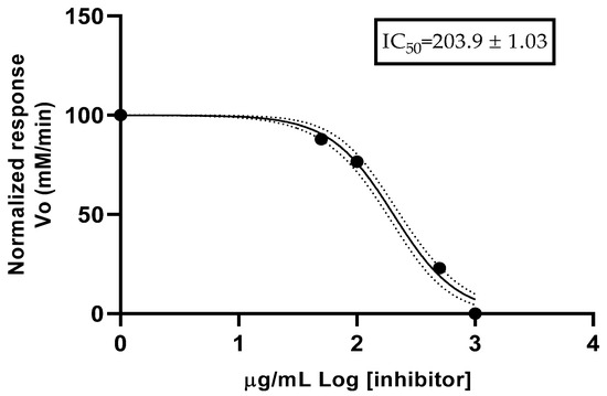 Figure 1 shows the rate of the reaction curve for anticholinesterase (anti-AChE) activity. The EO from fruits of Citrus x limonia exhibited a half-maximal inhibitory concentration (IC50) value of 203.9 ± 1.03 µg/mL. The positive control (donepezil) reported an IC50 value of 4.71 ± 0.51 µg/mL.