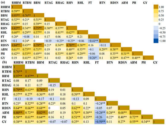 Correlation heatmap of (a) low-rhizome-biomass family and (b) high-rhizome-biomass family. Numbers in the box are correlation coefficients (r). * Significant at the 0.05 probability level. ** Significant at the 0.01 level. RHBM: rhizome biomass; RTBM: root biomass; BBM: belowground biomass; RHAG: rhizome angle; RTAG: root angle; RHN: rhizome number: RHL: rhizome length; FT: flowering time; BTN: basal tiller number; RDSN: rhizome-derived shoot number; PH: plant height; ABM: aboveground biomass; GY: grain yield.