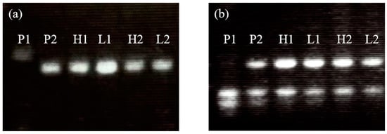 The selected gel figure of the markers linked to rhizome presence with co-dominant type (a) and hemizygous type (b). P1: S. bicolor; P2: S. propinquum; H1: first-round high-rhizome-biomass bulk; L1: first-round low-rhizome-biomass bulk; H2: second-round high-rhizome-biomass bulk; L2: second-round low-rhizome-biomass bulk.