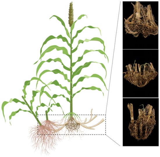 Genetic research on rhizome development has evolved over decades, identifying key genetic loci and molecular markers for traits such as overwintering and rhizome number [11,12,13,14,15]. Many quantitative trait loci (QTLs) regulating rhizome traits are evolutionarily conserved across species. For example, in rice (Oryza sativa L. × Oryza longistaminata A. Chev. & Roehr.), three QTLs correspond to sorghum homologs distributed among chromosomes 4, 6, and 10 [16,17]. Similar parallels exist in maize (Zea mays ssp. parviglumis × Zea diploperennis), although the number of homologous QTLs is fewer due to greater genetic distances between species [18]. Rhizomatousness encompasses various aspects, including the number of rhizome-derived shoots, rhizome length, and the count of subterranean rhizomes [14]. However, research specifically addressing rhizome biomass in sorghum, a direct measure of carbon sequestration in perennial crops, remains limited.