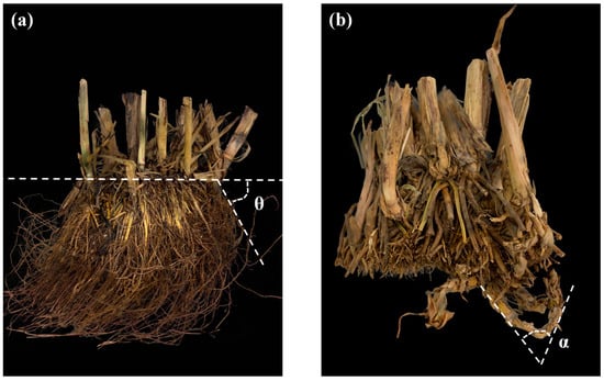 Ways to measure the root growth angle θ (a), and rhizome bending angle α (b).