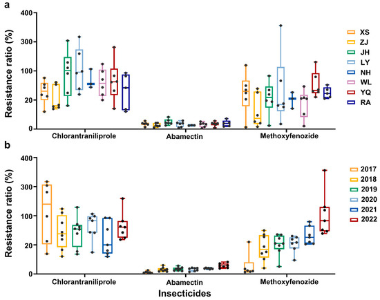- Meng, H.R.; Huang, R.; Wan, H.; Li, J.H.; Li, J.K.; Zhang, X.L. Insecticide resistance monitoring in field populations of Chilo suppressalis Walker (Lepidoptera: Crambidae) from central China. Front. Physiol. 2022, 13, 1029319. [Google Scholar] [CrossRef] [PubMed]