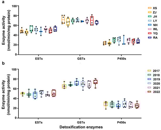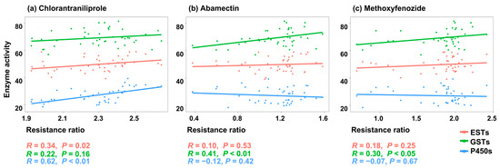 2.4. Correlations Between Detoxification Enzyme Activities and Insecticide Toxicities
