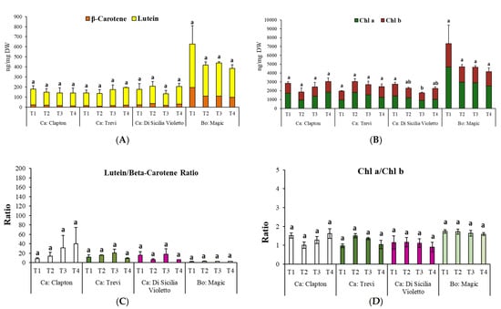 Effect of water regime (T1: watered well; T2: low stress; T3: moderate stress; and T4: severe stress) on (A): chlorophylls; (B): carotenoids accumulation; and (C): lutein/β-carotene. (D): chl a/chl b ratios in Brassica oleracea var. botrytis and Brassica oleracea var. italica var. Magic. Each bar indicates means and standard error of three replicates by using one-way ANOVA at p < 0.05. Letters indicate statistically significant differences between different cultivars in alphabetical order from highest to lowest. Ca: cauliflower and Bo: broccoli.