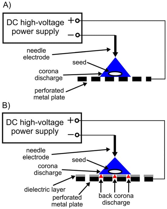 Seed treatment using the classical corona (A) and the back corona discharges (B).