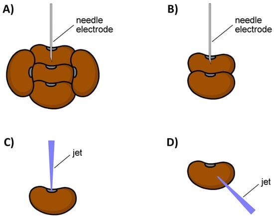 - Two seeds were treated simultaneously (CD-B and BC-B arrangements) as shown in Figure 2B: the needle electrode was positioned above the seed hila to target the area around the hilum to a greater extent.