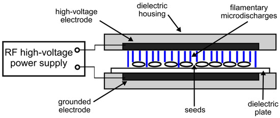 The fourth NTP source employed for the treatment of black locust seeds was a DBD operating in air at atmospheric pressure. The DBD reactor was constructed in a planar-parallel configuration with only one electrode covered with a dielectric layer in the form of a 1 mm thick ceramic plate. The presence of the dielectric barrier between the electrodes provided a quite regular distribution of the DBD plasma in the form of short-lasting filamentary micro-discharges (the duration ranged from tens to hundreds of nanoseconds). In addition, the dielectric barrier prevented the occurrence of spark discharges in the reactor. The electrode surface area was 120 cm2. The air gap between the electrodes, in which the seeds were placed, was 5 mm.