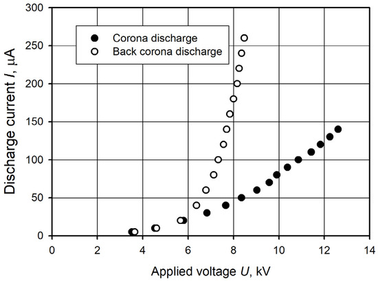 To characterize the corona discharges, we measured the volt-ampere characteristics of both types of corona discharges used. The graphs of the volt-ampere characteristics of the classical corona and back corona discharges at the interelectrode distance of 10 mm are given in Figure 5. It can be seen from the volt-ampere characteristics of the corona discharges that the back corona discharge has a significantly higher discharge current compared to the classical corona discharge at the same interelectrode distance and supply voltage. The onset voltage (determined at a discharge current of 5 µA) was lower in the classical corona discharge and was 3.5 kV, whereas in the back corona discharge, it was 3.7 kV. With an increasing discharge voltage, a significantly steeper increase in the current was observed in the back corona discharge (Figure 5). A voltage of 10.9 kV was required to achieve a discharge current of 100 µA in the classical corona discharge, while only 7.3 kV was needed for the back corona discharge.