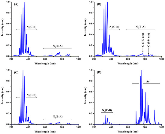 Emission spectra of the classical corona discharge (A), back corona discharge (B), DBD (C), and argon APPJ (D).