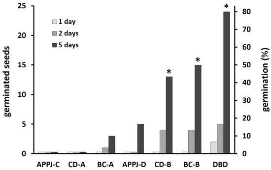 According to the obtained results, it can be stated that the classical corona discharge, back corona discharge, argon APPJ, and DBD have a positive effect on both imbibition and germination of black locust seeds. However, the efficiency of different treatment methods varies significantly. In the case of the control samples (untreated seeds), none of the seeds germinated as of the fifth day after being placed in a moistened Petri dish, and the maximum number of imbibed seeds due to water uptake was equal to four, which is 13.3% of the total number of seeds in the control group.