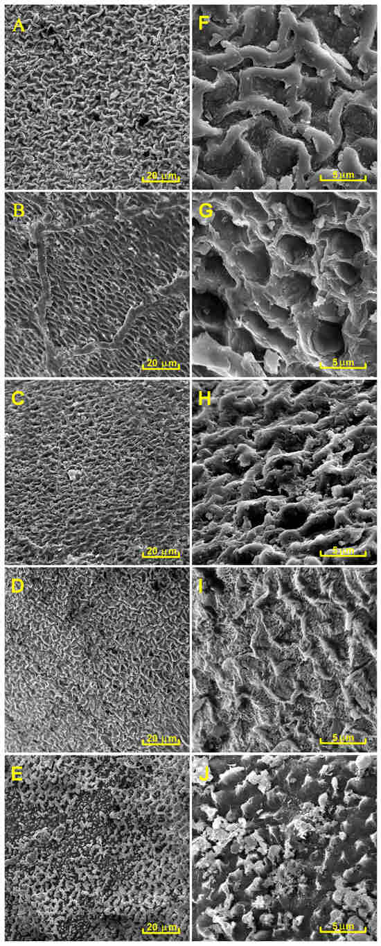 SEM images of black locust seeds treated with different NTP sources for 30 min: (A,F)—control samples, (B,G)—treated with the corona discharge, (C,H)—treated with the back corona, (D,I)—treated with the argon APPJ, and (E,J)—treated with the DBD.