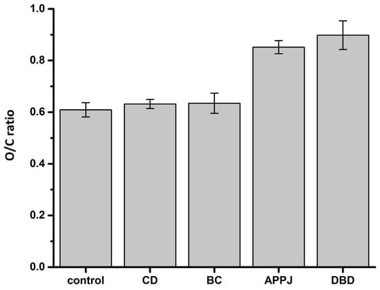 Table 2 indicates that the exposure of black locust seeds to different NTP sources for 30 min led to noticeable changes in their surface properties, expressed by water contact angle and surface free energy. The smallest changes in WCA and SFE compared to the control (untreated) seeds were observed after the CD-A treatment. The water contact angle and free surface energy of the control seeds were WCA = (118 ± 3) and SFE = (5.1 ± 0.9) mJ/m2, while for the seeds exposed to the classical corona discharge (CD-A treatment) for 30 min, they became WCA = (107 ± 4) and SFE = (9.2 ± 1.4) mJ/m2. The most significant changes in the surface properties of black locust seeds were observed after exposure to the DBD and the argon APPJ directed to the seed side surface (APPJ-D treatment). In both cases, it was not possible to measure the water contact angle, as the seed surface was completely wetted. It is noteworthy that the APPJ-C treatment, i.e., when the plasma jet was directed to the seed hilum (Figure 2C), was not as effective as the APPJ-D treatment in terms of seed surface modification. In the case of the APPJ-C treatment for 30 min, the water contact angle and surface free energy of the seed coat were equal to WCA = (94 ± 4) and SFE = (16 ± 2) mJ/m2. In the case of the classical corona and back corona discharges, the placement of seeds during their treatment was also of decisive importance. The results indicate (Table 2) that the simultaneous treatment of two seeds with the needle electrode positioned between them (Figure 2B) was more effective than the simultaneous treatment of five seeds with the needle electrode located above the central seed (Figure 2A). When switching from the BC-A treatment to the BC-B one, there was a significant decrease in the water contact angle from (98 ± 4) to (49 ± 2) with a corresponding increase in the surface free energy from (14 ± 2) mJ/m2 to (50 ± 2) mJ/m2, respectively. A similar trend, but less pronounced, was observed with the classical corona discharge.