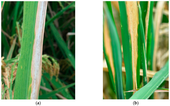 Comparison of rice bacterial blight with similar symptoms caused by different bacterial strains in field conditions: (a) Xanthomonas oryzae pv. oryzae and (b) P. ananatis and E. asburiae.