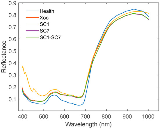 Spectral profiles of healthy rice leaves and rice leaves infected with different bacteria. Health represents healthy rice leaves, Xoo represents leaves inoculated with pathogen Xoo PXO99A, and SC1, SC7, and SC1–SC7 represent leaves inoculated with the E. asburiae strain SC1, the P. ananatis strain SC7, and their mixed pathogen, respectively.