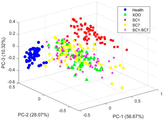 PCA was employed to reduce the dimensionality of the 224 spectral bands, enabling three-dimensional visualization of the sample distribution among groups. In this representation, samples that are positioned closer together exhibit greater spectral similarity. As shown in Figure 3, the first three principal components cumulatively account for 95.06% of the total variance (56.67% + 28.07% + 10.32%), indicating that they capture the majority of variation in the original dataset. The PCA plot demonstrates that both the Health and SC1 groups are clearly distinguishable from the other three groups, reflecting distinct spectral features unique to these categories. Notably, the Health group forms a compact and isolated cluster, underscoring its significant divergence from the infected samples. In contrast, substantial overlap is observed among the Xoo, SC7, and SC1–SC7 groups, reflecting similar spectral characteristics. However, the SC1 group clusters along the PC1 axis suggest that its spectral features are sufficiently unique for accurate classification in contrast to the considerable overlap observed among the Xoo, SC7, and SC1–SC7 groups. The clustering patterns reveal that, while PCA effectively separates healthy samples from infected samples, advanced classification techniques, such as machine learning, are necessary to resolve the ambiguity among overlapping disease categories.