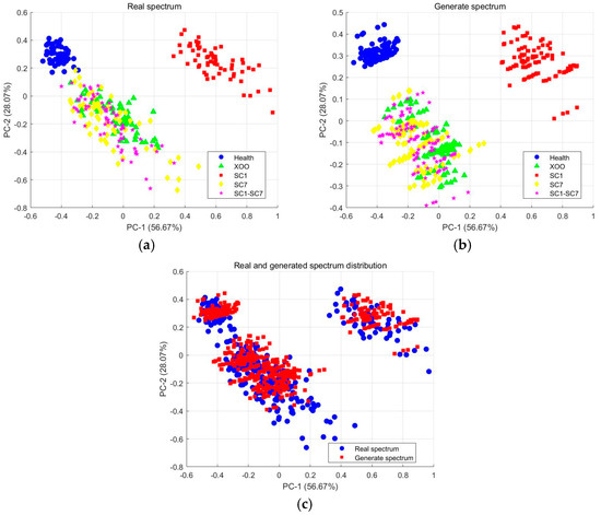 PCA results of real and generated spectra: (a) real spectra, (b) generated spectra, and (c) comparison of distribution between real and generated spectra.