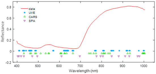 Modeling with a full spectrum of data consisting of 224 wavelength points introduced excessive complexity due to high collinearity and redundant information, which increased computational demands and hindered model performance. To address these issues, we applied feature selection methods, namely uninformative variable elimination (UVE), competitive adaptive reweighted sampling (CARS), and successive projections algorithm (SPA), to identify key wavelength bands while preserving critical spectral information. These methods effectively reduced data dimensionality and computational complexity. UVE, CARS, and SPA identified 49, 33, and 17 key wavelengths, respectively. By focusing on these selected bands, model complexity, and computational demands were significantly reduced without compromising essential spectral information. The specific wavelength positions identified by each method are shown in Figure 5.