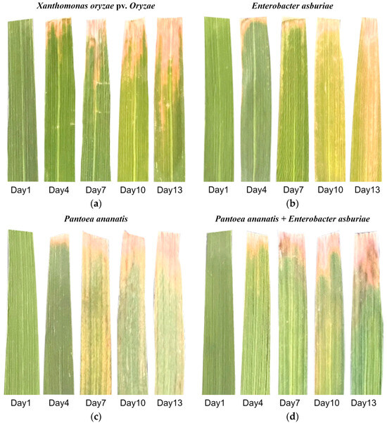 Disease progression in rice leaves infected with different pathogen strains: (a) Xanthomonas oryzae pv. oryzae (Xoo); (b) Enterobacter asburiae (SC1); (c) Pantoea ananatis (SC7); and (d) mixture of Pantoea ananatis and Enterobacter asburiae (SC1–SC7).
