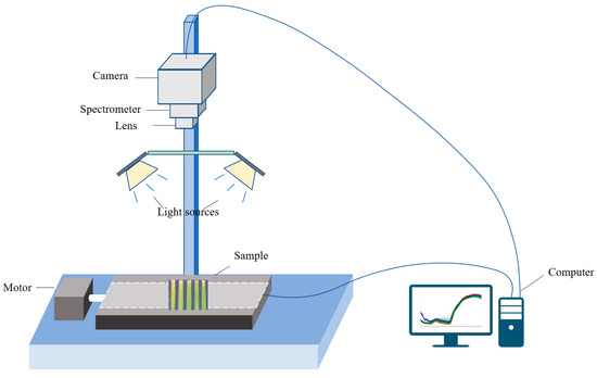 After calibration, the region of interest (ROI) for each sample was selected, and the average spectral data were extracted, resulting in a spectral data matrix of size 308 × 224 (308 samples and 224 bands). All steps, including calibration, ROI selection, image segmentation, and spectral data extraction, were performed using ENVI 5.2 software. The process for obtaining hyperspectral data is illustrated in Figure 7.
