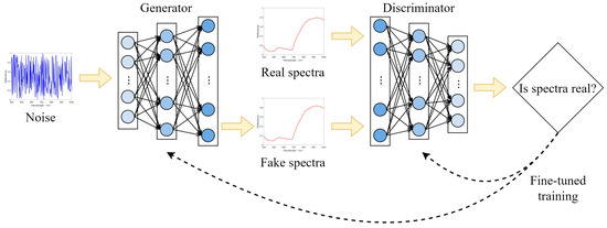 In this study, as the spectra to be generated were one-dimensional and of relatively low complexity, a multi-layer neural network was adopted for the GAN architecture. The Generator was designed as a three-layer neural network with layer sizes of 128, 256, and 512, each utilizing a LeakyReLU activation function (alpha = 0.2). Similarly, the Discriminator consisted of layers with 512, 256, and 128, followed by a softmax layer, and employed a Sigmoid activation function. The model was trained using the Adam optimization algorithm with a batch size of 4, a learning rate of 0.00005, and a maximum of 2000 iterations. The GAN workflow is depicted in Figure 8.