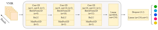 1DCNN is a deep learning architecture optimized for sequential data, allowing the extraction of local patterns and temporal dependencies. This architecture performs convolutional operations along a single dimension, followed by pooling layers, to learn hierarchical features. Its ability to capture intricate relationships across spectral bands makes it particularly effective for analyzing hyperspectral data. The 1DCNN model architecture consists of three convolutional segments, each comprising a convolutional (Conv) layer (with kernel sizes: 5 × 1, 3 × 1, and 1 × 1, respectively) and a batch normalization (BN) layer, with channel counts of 8, 16, and 32. The extracted features were flattened and passed through a fully connected (FC) layer with 256 nodes. Cross-entropy was used as the loss function during the training phase. The Adam optimizer was employed for model training, with a learning rate set at 0.0001. The batch size and maximum number of training epochs were set to 64 and 600, respectively, while potential overfitting issues were addressed by setting the L2 weight decay parameter to 0.0001. The architecture of the developed 1DCNN model is illustrated in Figure 9.
