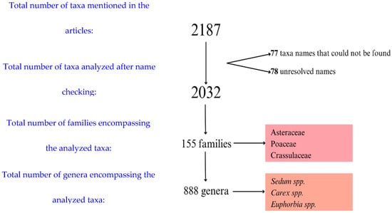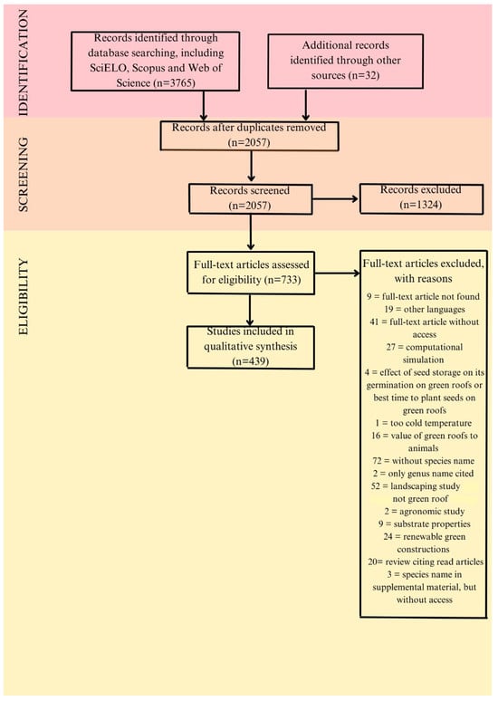 To survey a broad set of studies, the first step entailed a thorough bibliographic search consulting different web archives and specific scientific literature following a standardized meta-analysis (Figure 1). Electronic databases (SciELO, Scopus, and Web of Science) were consulted, setting a time window from 2009 to July 2023, using the following keywords: (techo verde OR telhado verde OR green roof OR rooftop OR roof top OR roof garde*) AND (plant* OR species). Bibliographic items included articles, reviews, corrections, books, and chapters. All the data were downloaded and imported into the reference manager Mendeley (Elsevier), and duplicated records were removed. The remaining records were analyzed and the number of species that were highlighted as appropriate or not for the use in green roofs were identified, as well as the number of times a species was noted in the database (frequency of use in extensive green roof). The species list included a set of green roof plants commonly used or spontaneously occurring on extensive green roofs. Plants reported in these papers were organized in a floristic database, and their names were standardized to the most recent nomenclature using the Plant List (updated access on 12 September 2023) (SM1). To avoid repeating new scientific names and synonyms in the checklist, the taxonomic resolution of the source consulted was followed.