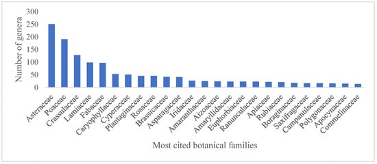 The review identified species used in green roofs all around the world, affording a broad database of the botanical tools applied in this technology. As a result, 439 studies were included in the qualitative synthesis (SM2). Overall, 2187 taxa were cited in the articles, including varieties and cultivars. However, after checking the species name in the Plant List [28], taxa names that could not be found (77) and unresolved names (78) were excluded. The frequency of the 2032 remaining species was analyzed. These species of green roof plants encompassed 888 genera in 155 families. Considering the entire dataset, the most cited families were Asteraceae (251 out of approx. 2812 genera), Poaceae (183 out of approx. 1768 genera), and Crassulaceae (101 out of 140 genera) (Figure 2), whereas the most cited genera were Sedum (109 species, Crassulaceae), Carex (29 species, Cyperaceae), and Euphorbia (26 species, Euphorbiaceae) (Figure 3). Overall, green roof studies indicate a preference for species in the triad Asteraceae, Poaceae, and Crassulaceae, which encompass a large and diverse set of species. However, it may be useful to explore species within other botanical families for use in rooftops aiming at increased diversification.