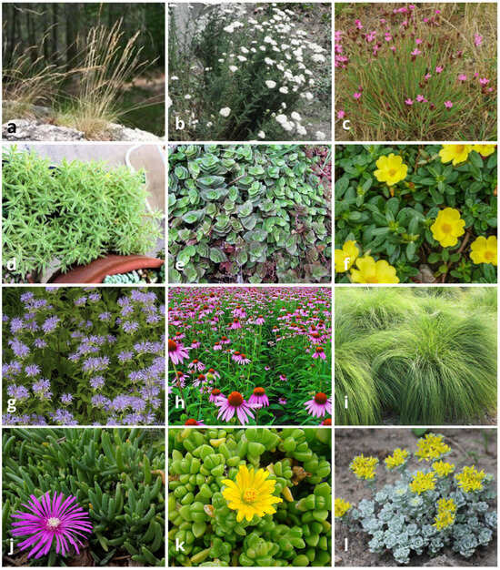 Representative species of temperate (a–c), tropical (d–f), continental (g–i), and dry (j–l) climates mentioned in articles as being useful for establishing extensive green roofs. Images are from Plants of the World Online [28} and World Flora Online [29]. (a). Festuca ovina; (b). Achillea millefolium; (c). Dianthus carthusianorum; (d). Sedum lineare; (e). Callisia repens; (f). Portulaca oleracea; (g). Monarda fistulosa; (h). Echinacea purpurea; (i). Sporobolus heterolepis; (j). Delosperma cooperi; (k). Delosperma nubigenum; (l). Sedum spathulifolium.