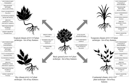 Features of the basic ideal plant archetype for use in green roofs and derived ones found as more suitable for temperate, tropical, continental, and dry climate.