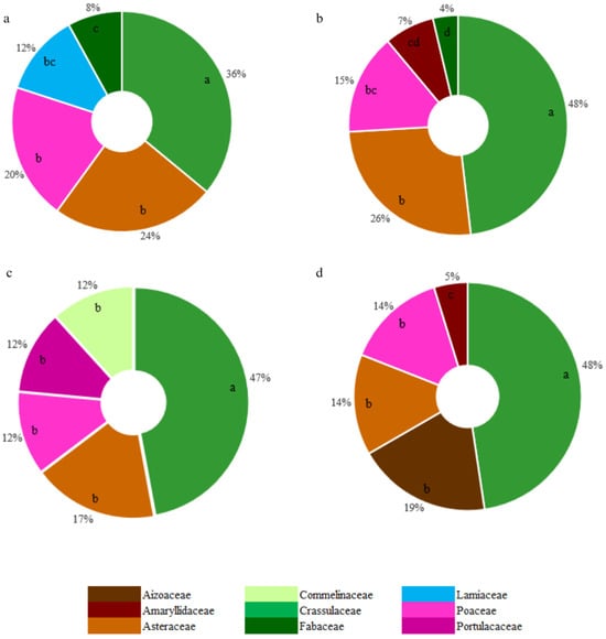 The 5 most mentioned green roof botanical families in each climate: (a) temperate, (b) continental, (c) tropical, and (d) dry. Sections not sharing a letter within each climate are significantly different (p ≤ 0.05).