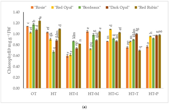 The chlorophyll b content in Sweet Basil plants grown under optimal temperature conditions varied from 1.03 mg g−1 FW to 1.24 mg g−1 FW depending on the purple varieties’ cultivars (Figure 4a) and from 0.77 mg g−1 FW to 1.13 mg g−1 FW depending on the green varieties’ cultivars (Figure 4b). High-temperature stress significantly decreased chlorophyll b content in the purple varieties’ cultivars compared to Sweet Basil plants grown under optimal temperature conditions. Foliar application of L-Methionine to high-temperature stressed plants increased chlorophyll b content in the cultivars “Genovese” and “Italiano Classico”, while the highest chlorophyll b content of “Red Opal” was obtained under the application of L-Glutamine. The foliar spraying with L-Phenylalanine had a positive effect on the green variety cultivar “Marseillais”.