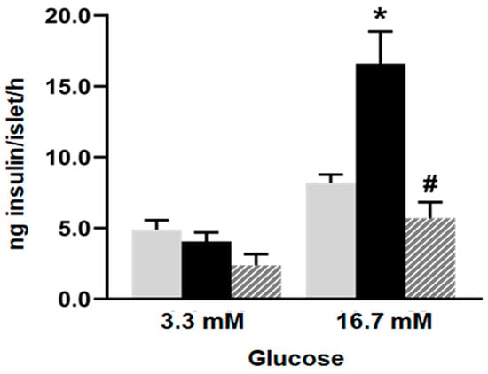 Glucose-induced insulin secretion. Insulin secretion in response to 3.3 and 16.7 mM glucose by islets isolated from C (grey bars), F (black bars), and I (lined bars) rats. Data are shown as means ± SEM from three independent experiments. * p < 0.05 vs. C; # p < 0.05 vs. F. Insulin released into incubation media was expressed as ng of insulin per islet/h.