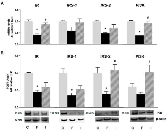Gene expression of IR, IRS-1, IRS-2, and PI3K evaluated in pancreatic islets isolated from C (grey bars), F (black bars), and I (lined bars) rats. (A) mRNA relative expression measured by RT qPCR. β-actin employed as housekeeping gene. Data are shown as arbitrary units (AUs) with respect to mRNA level measured in C group. Bars represent means ± SEM from three independent experiments. (B) Protein levels determined by Western blot in islet homogenates from all experimental groups. Representative blot is shown in each case. Bars represent means ± SEM expressed in arbitrary units (AUs) as ratio between protein of interest (POI) and β-actin band intensity. * p < 0.05 vs. C; # p < 0.05 vs. F. n = 6 rats/group.